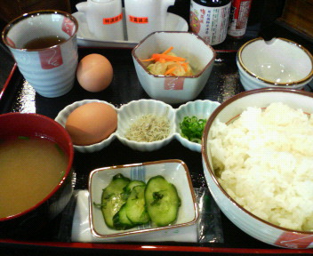 ほかほかで適度な固さに炊かれた丼なみなみによそられたご飯に生卵2個というリッチな感じ。小鉢に刻みネギ、干しシラス、漬物に味噌汁。