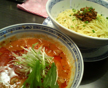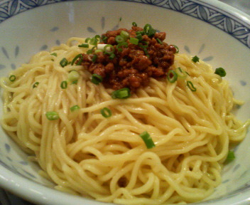 予想通りの赤い液が入ったつけスープ。表面は赤めの半透明なのでラー油なのか。麺は茹で上げた後、何かと和えていたが、何かは分からない。上にはひき肉ですね。