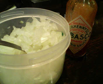「出来ますが味が少し変わりますが…」ん〜初見で変わったのを食べても何だし、ヤサイトッピングはなしでオ〜ダ〜。するとすぐに刻みタマネギとタバスコが登場。