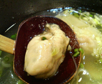 牡蠣以外は白髪葱の辛味噌和え、筒切りの長葱を焙った感じのもの(しかし温かった)、肉ワンタン一つとたくさんの刻み葱。