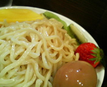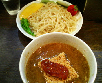 麺はデフォかな?水で〆られたつけ麺です。しかし麺って皿盛りすると少なく感じるなぁ。麺の皿にはイチゴ、キュウイ、マンゴー?、○○玉子、つけスープご飯を揚げたの(おかき?)、ドライトマトとのこと。