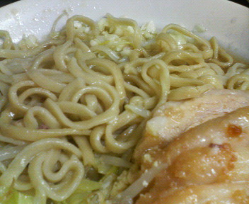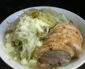 少しクタった柔めのヤサイを先に食べて次に麺。しかし麺が・・・多い。平打ちな感じの麺は堅めではないけどちょうどイイ感じでスープと絡んで、うまー。チーズのコクも入っていていつもより濃いように感じます。