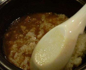 ちと物足りなさを感じましたたので、急遽、無料ご飯をオーダーし、貰ったご飯をそのままスープにIN!
