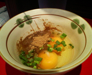 つけつけして食べてみると、若干粘度があるスープがしっかり麺に絡んでうまいです。デフォのラーメンの麺はもう少しボキボキしたイメージでしたが今回のつけめんの麺はデフォのラーメンと麺と変えたのかな?変えてないのかな?通ってないから分からないです・・・。スキヤキダブル=生卵+カネシ?+刻み青ネギ+鰹節といったところでしょうか。