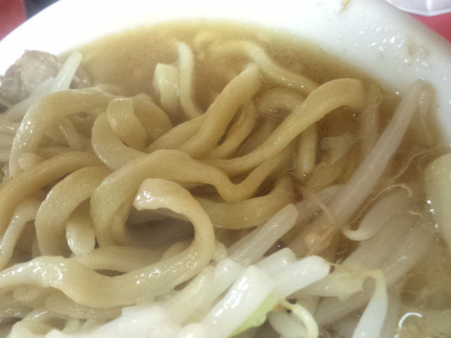 いつもなら野菜を先に殆ど食べるのですが、野菜は少し残して麺へ。相変わらず極太の縮れ麺でちと堅めに感じます。極太でも負けてないしっかりコクとうまみに脂もあわさってうまっ。