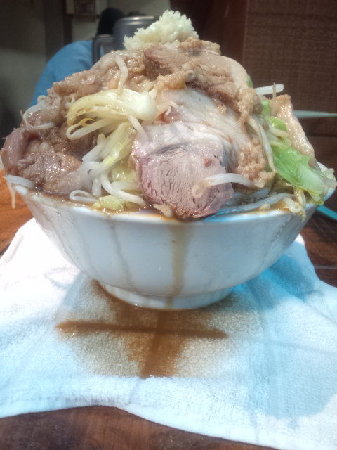 中々盛って頂きました・・・が、箸の付けようがない盛り付けです。しかし以前、西の方で経験済みで対応方法は問題なし。そして予想通り決壊して、スープが溢れているのでおしぼりを器の下に敷いて対応。早速食べていきます。