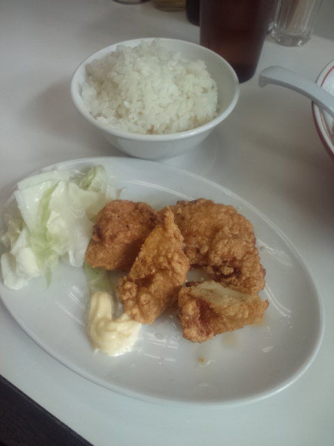 レンゲを使いながらスープを多めに口に入れるようにして麺をすするとうま。後半までその食べ方で楽しんでいると、麺より遅れて唐揚げ到着♪