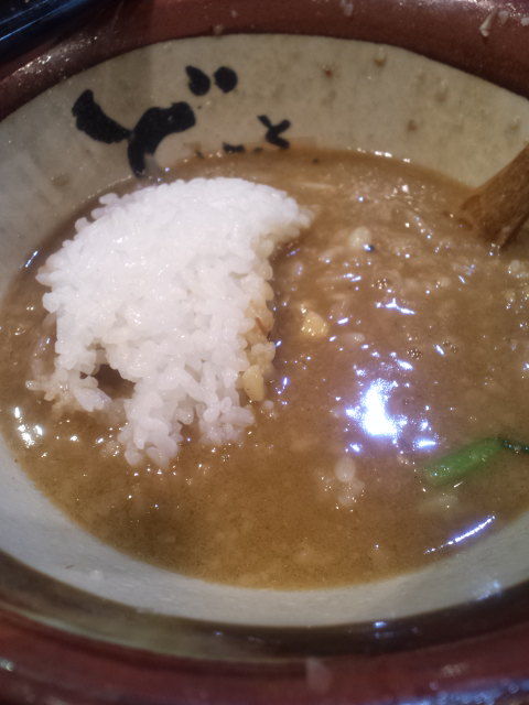端っこ豚2個はテンション上がりましたが、厚いこともあってちと堅めでまたまたアゴが疲れましたよ・・・。調子に乗ってライスを購入して簡易おじやに。うまかったですがライスでは受け止められない感じかなぁ。ホントに濃厚な強力スープでした。