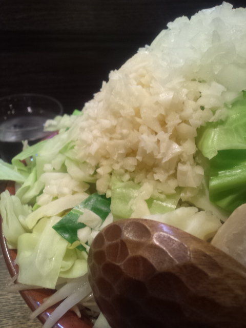 ちと苦戦し、時間がかかって野菜を食べ終わり麺へ。崩さないように食べるのに気を使ったのと、キャベツを食べるのにアゴが疲れペースが上がりませんでした。