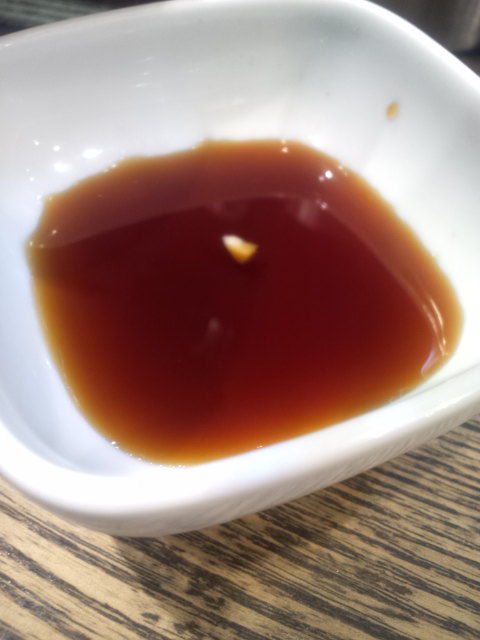 器を受け取り食べようとすると、「野菜に掛けて食べてください」と醤油のようなものをもらいました。甘めでコクのある醤油ですが、しつこくなく味付けにはちょうどイイ感じ。げんまんのカエシだったりするのかな?