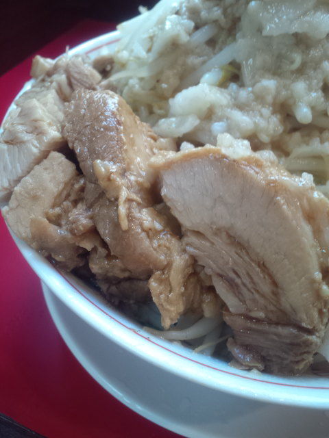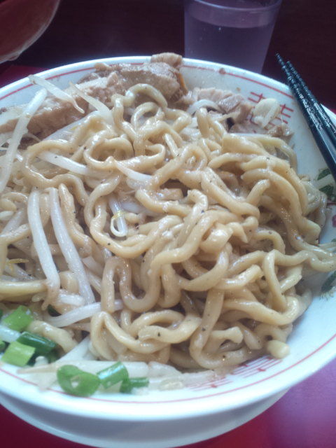 まずは上からと野菜を頂いていきますが、脂ともやしを混ぜ混ぜして頂くとうま。スープ?もしくはカネシ?をちとかけたい感じもありますけど、これはこれでうまいと思います。