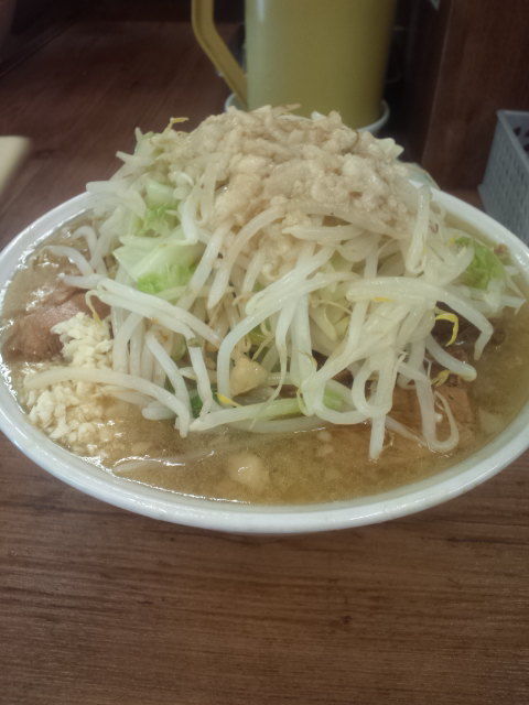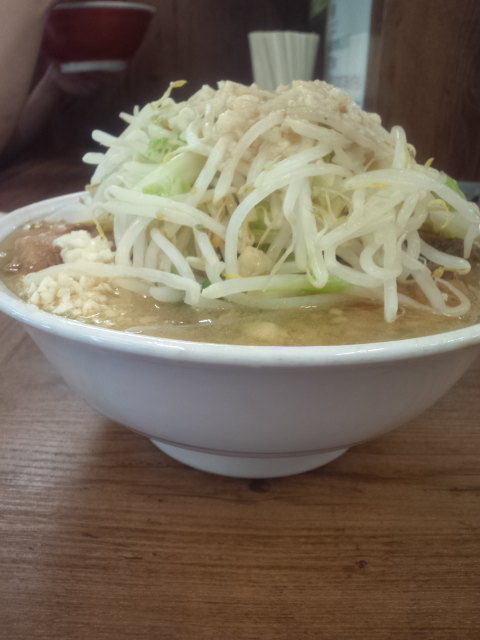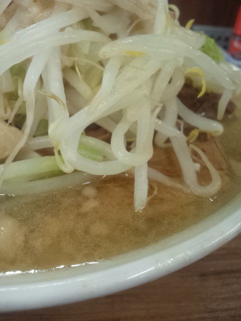 やっぱ器がデカっ。箸を入れてみると麺がギッシリ入っているので、十分・・・どころか五十分に楽しめそうです。二郎でもレンゲが常備されている少ないお店のコチラ、まずはレンゲでスープを頂いてみると、うま〜っ。乳化したスープにしっかり出汁が出ていて、量の多い麺も全く問題ないように感じます。