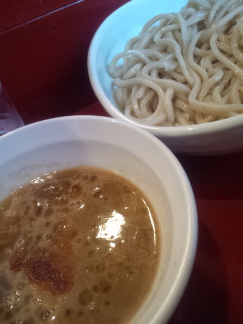 麺茹で、スープと大きな網で野菜や肉を炙っているようです。夜は夜で色々楽しめそうな感じかなぁ・・・と思ったところで、つけ麺到着♪