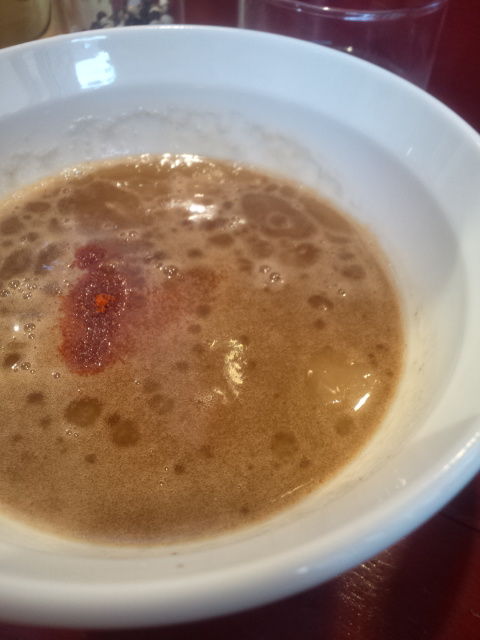 麺を食べ終わるとスープの残りはかなり少ない感じに。私はつけすぎなのかな?他の方はスープ割を頼んでいましたからね。