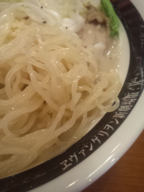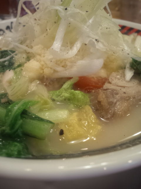 麺はデフォでしょうか。細めで透明感がある麺です。アスカのトマト麺では麺が負けているように感じましたが、コチラはまだバランスは良く感じます。麺をすすっているとトッピングの粉チーズが溶けてチーズ風味に。いや、極端には変わりませんでしたが香り的に。最後まで黒胡椒が支配しているように、インパクトはそこに感じました。