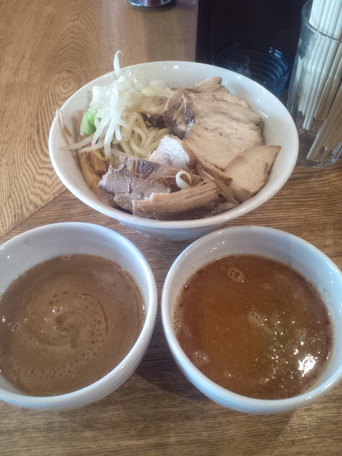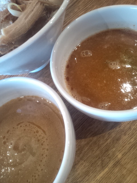 麺は中太ですごいコシのあるほぼストレートで、どちらのスープも粘度がしっかりなのでスープの減りが早い早い。ですが、大盛りにしましたけど、2つのつけスープで大盛りの麺量では私には足りないっす、というかスープが余りまくりでした。