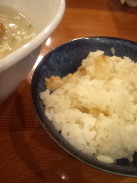 この「ご飯」は普通の白いご飯ではなく、麺が食べ終わってから残ったスープに入れる簡易雑炊用に炊かれたもの、らしいです。以前の訪問では洗いメシだったです・・・いつ変わったんだろ。