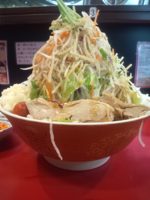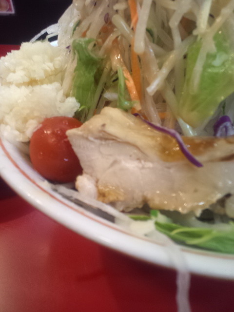しかし野菜の量に対してドレッシングが少ないです・・・。ヤサイマシマシにしてもドレッシング量は変わらない?ということはなさそうですが。普段から野菜にはあまりドレッシングなどはかけない方ですからぁ、と暗示をかけてバリバリと食べていきます。