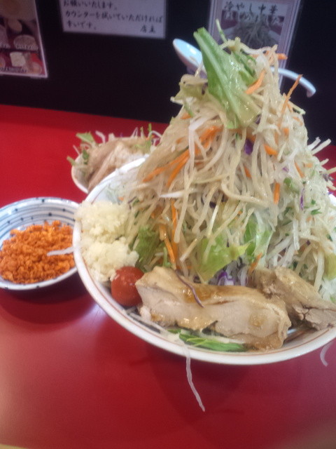 思いの他食感があるのでアゴが疲れてきます・・・。温野菜系と違ってすぐに飲み込めないので、中々野菜が減りません。何か体が冷えてきたな、と思っても温かいものはありません。もちろん鶏チャーシューも冷たいので、水ではない汁物が欲しくなりますね。野菜の後半にちと時間が掛かりつつも麺へ。