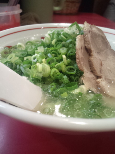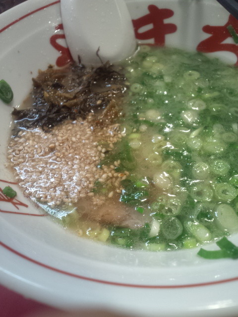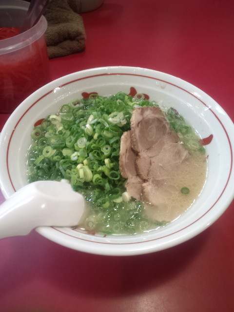 替え玉はバリカタで、麺のボキボキと粉っぽさを、卓上の味変と共に頂いて完食。ネギがコレだけ入っているので、さすがにネギに占有されてしまいますね。