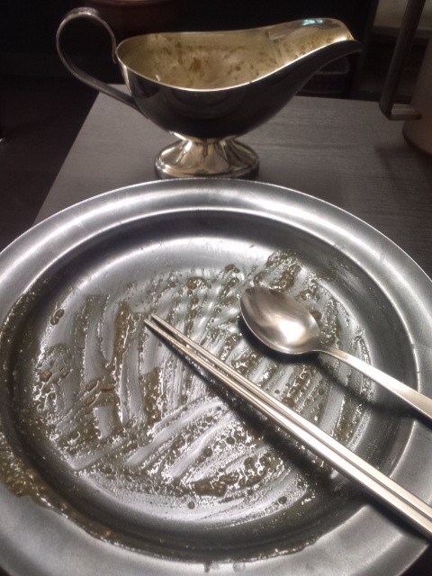 食べ進めて、最後にルーを入れたらこのバランス・・・超高級カレーに見えないこともないですが。まぁそれでも卓上の福神漬けも貰って、無事に完食しました。らっきょがない店は今までにもたくさんありましたけど、卓上にニンニクが置いてあるカレー店は初めてでしたね。