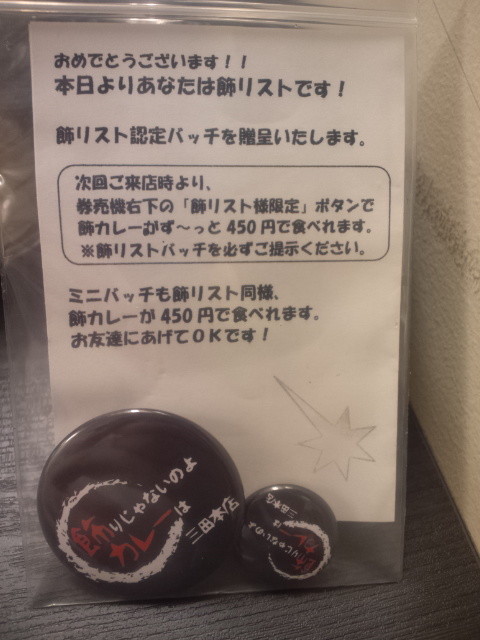 で、何とか完食できたのでバッチを貰えました。20分切るくらい。このバッチを持っていると、コチラの飾りカレー(普通盛り)500円がずっと450円!とのこと。
