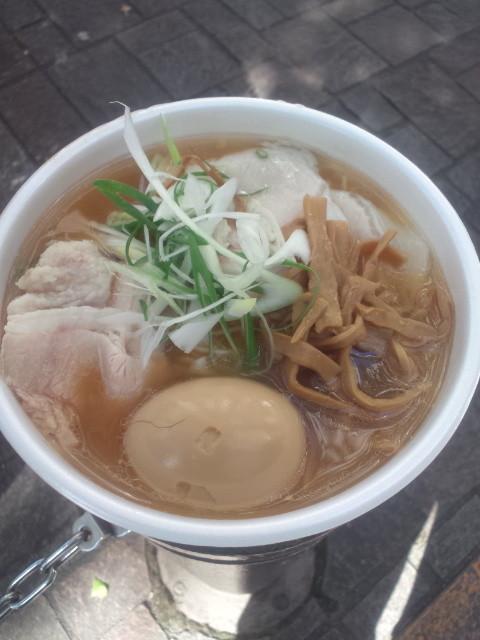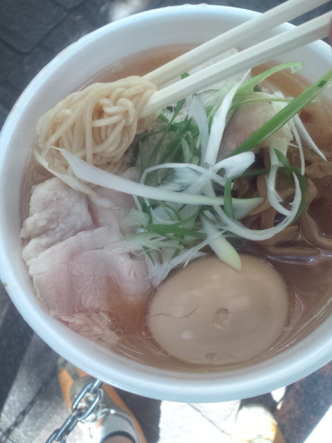 半分表面はチャーシューに覆われてテンションが上がりますが、近くの席を取られてしまって、ちとテンションダウン。まぁ席が日向、直射日光がもろの場所だったので、私の携帯では写真が撮れない場所ですし、日陰で十分!と思うことして立って食べていきます。