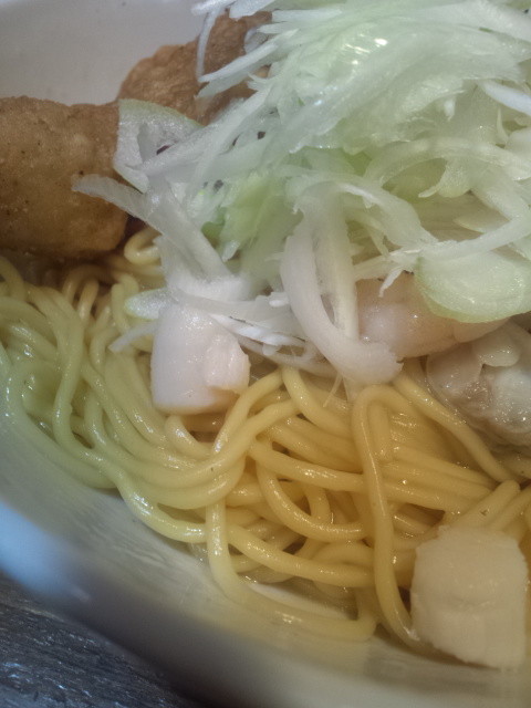 存在感のあるフライドチキン、的な形状のもの。他にもエビ、貝柱、帆立、あさりらのシーフード、海苔、てんこ盛りの刻みネギとメンマのようです。器を受け取る際に「スープ割りがあるので、適当なところで言ってください」とのこと 。