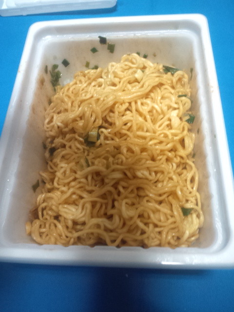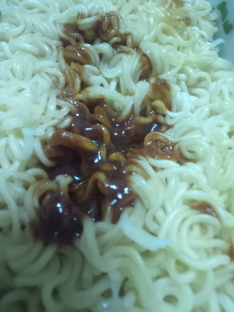 麺はカップヌードルのデフォっぽく、ちと平打ちで縮れた感じ。早めに開けたので麺堅めの仕上がりですが、この仕上がりはスープと合っているように思えます。
