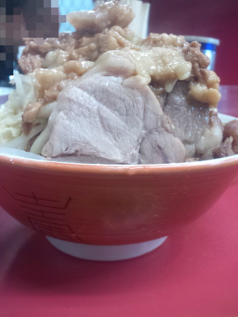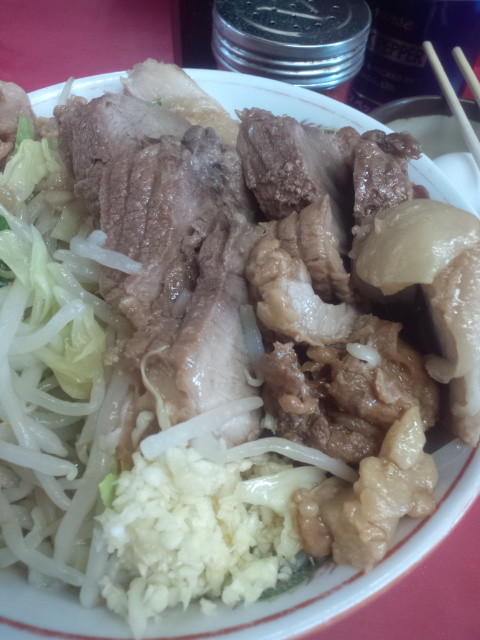 で、上から野菜から頂きたいですが、まずは頂上の脂の塊をちと端に避けて、避け切れなかった脂と野菜とを混ぜ混ぜ、うま。