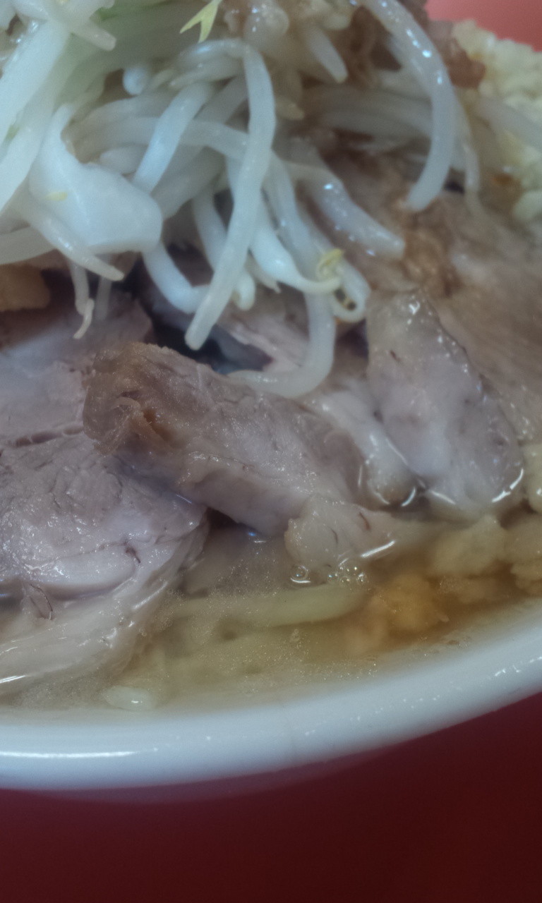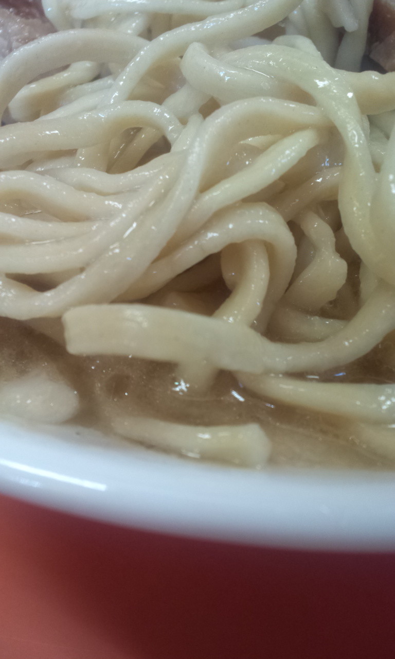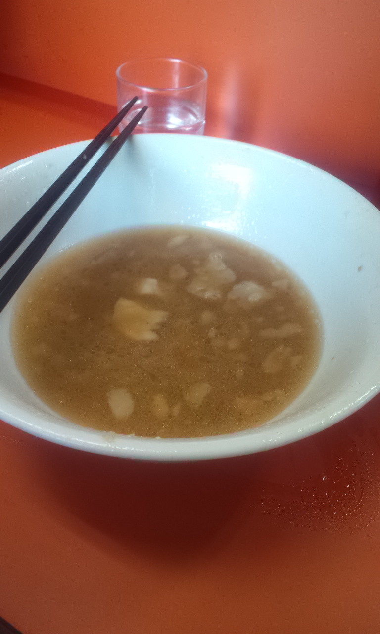 遅めの時間だからか土曜だからか、重めのスープに軽くカエシがビビッときてますが、これも尖った感じはなくて、うまみしっかりで甘め。すごい好みなんですけど!気持ち堅め残り、中太〜太麺のちと平打ちなストレート麺。麺とのバランスも好みで、しっかりスープの持ち上げもあってうんまーい!