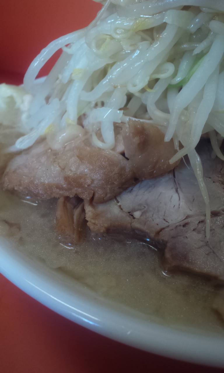 しかしこんなに麺が多いんでしたっけ?調理作業中の印象。大にしなくて良かったなぁ、と、まずは上から頂いていきます。