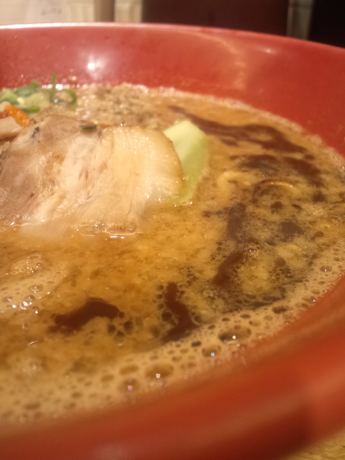 (他店も含めて)「詐欺じゃん!」的なメニュー写真とのギャップもある商品の中、山は低めですが並々と注がれたスープ。