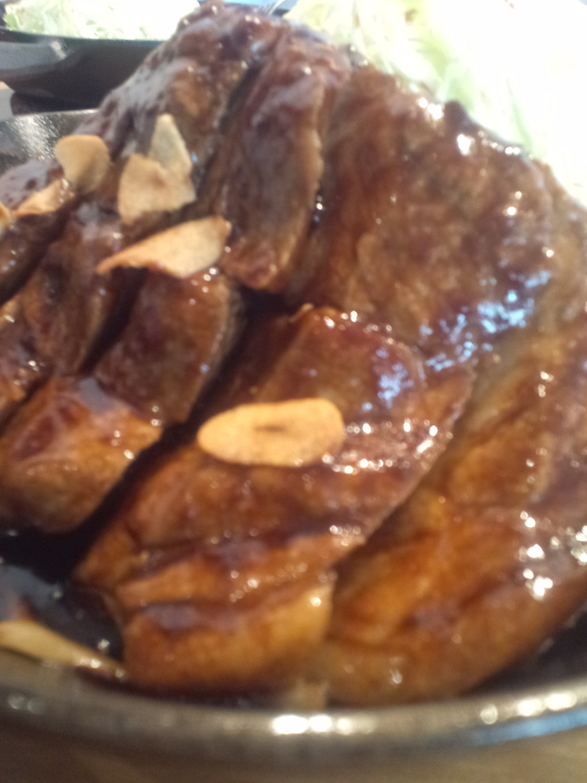 醤油系な濃い色のソースがドバッと。ジュージューとは聞こえませんが、香ばしい匂いはしっかりと。醤油系のソース、もちっと少なくても良さげかも。