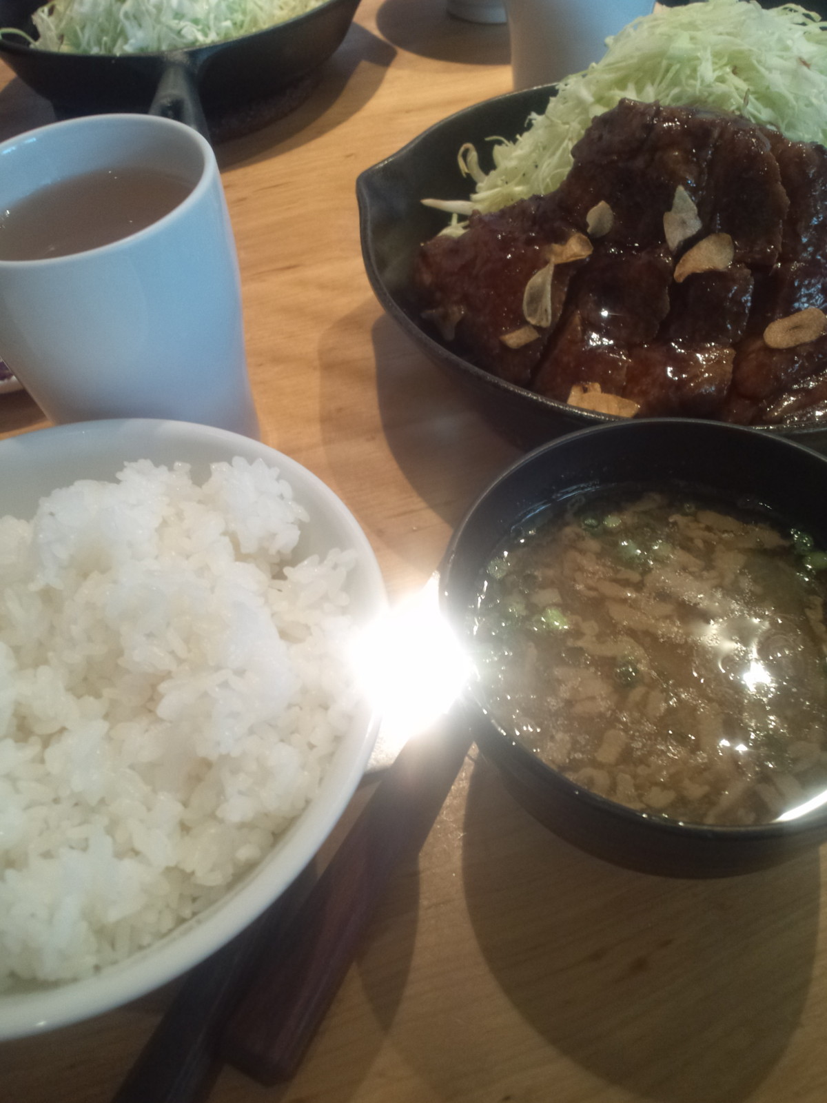 ご飯は気持ち固め、普通にうま。味噌汁は脂で蓋をされており、前半でその熱さに気付きましたが、結局中盤でもまだ熱いっす。時々かき混ぜながら、肉と野菜とご飯を食べていきます。