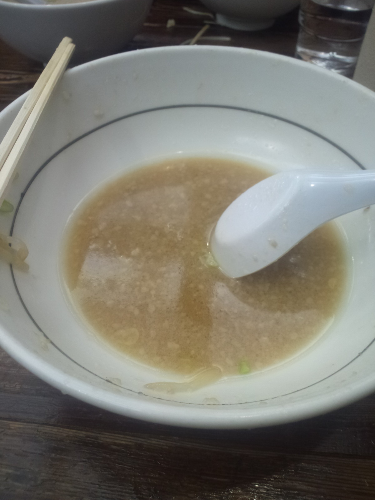 久し振りに後半に残ったチャーシュー、重くてきつめ。でも残したら負け、負けと思っております。残ったスープからもやしをすくって完食です。スープをそんなに飲んだ印象ないんですけど、結構残ってないなぁ。
