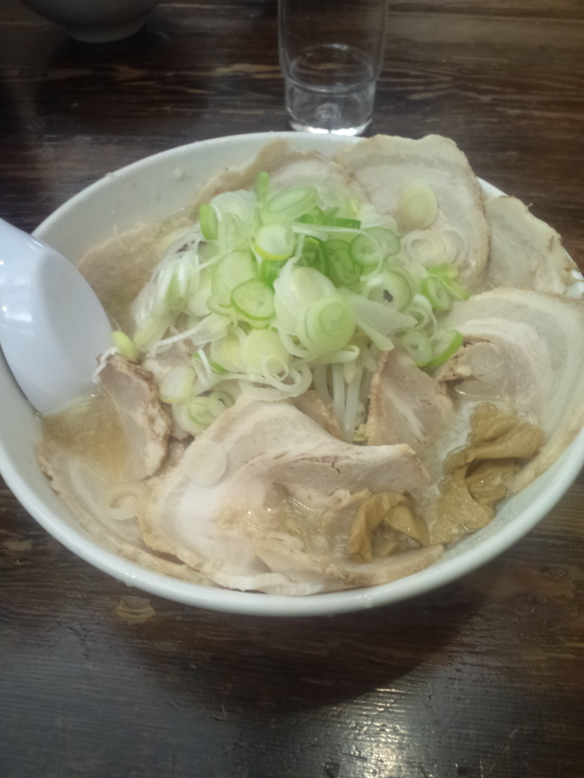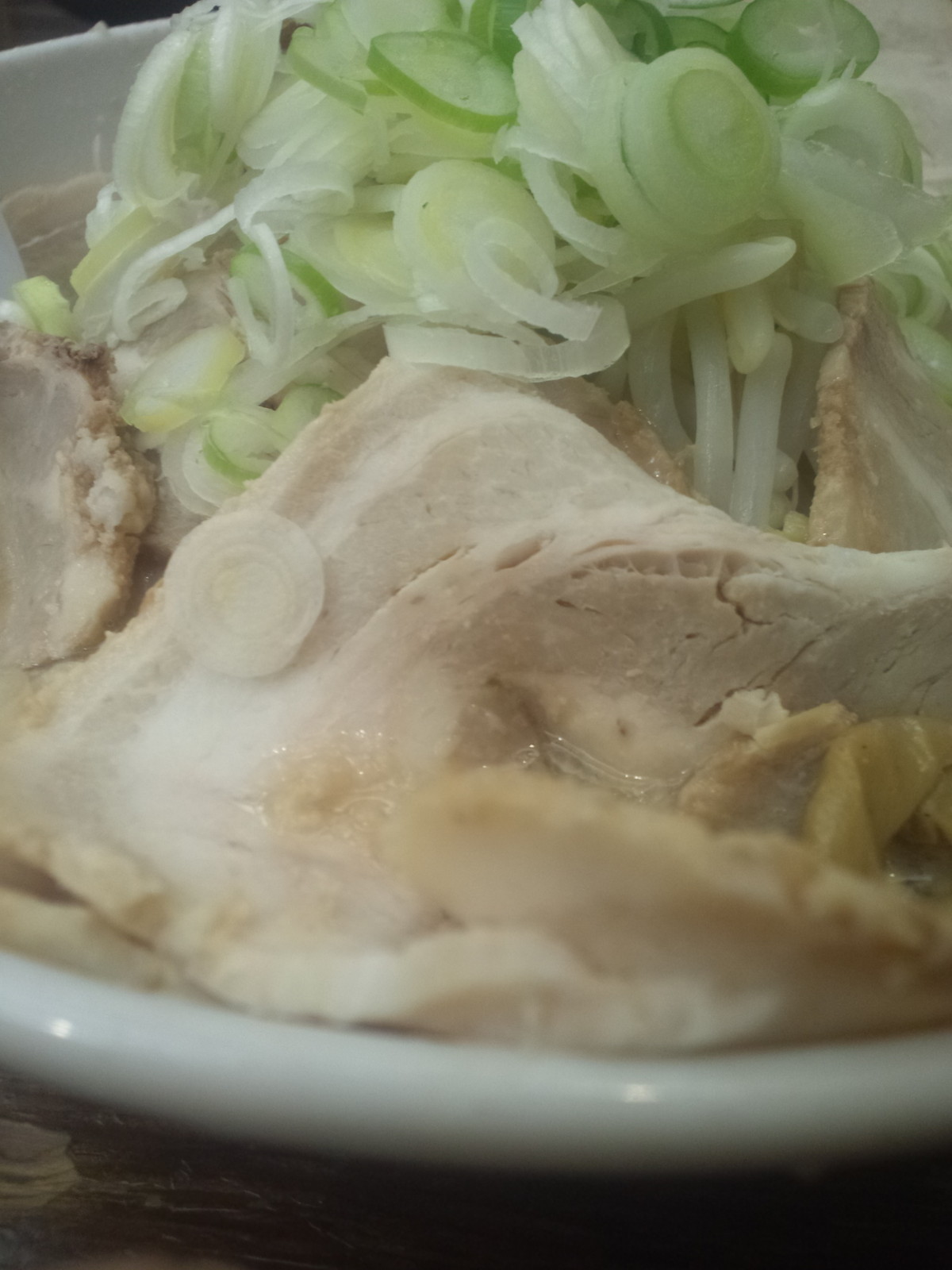 脂の重さをネギの仕事で和らいでリセットして貰いながら、後半からはチャーシューを多めに頂いていきます。スープに浸けておいたチャーシューは、熱くは感じませんけど、冷たい脂のイヤな感じがするほどまで冷たい訳ではないのですが、スープと被っての脂過多・・・。