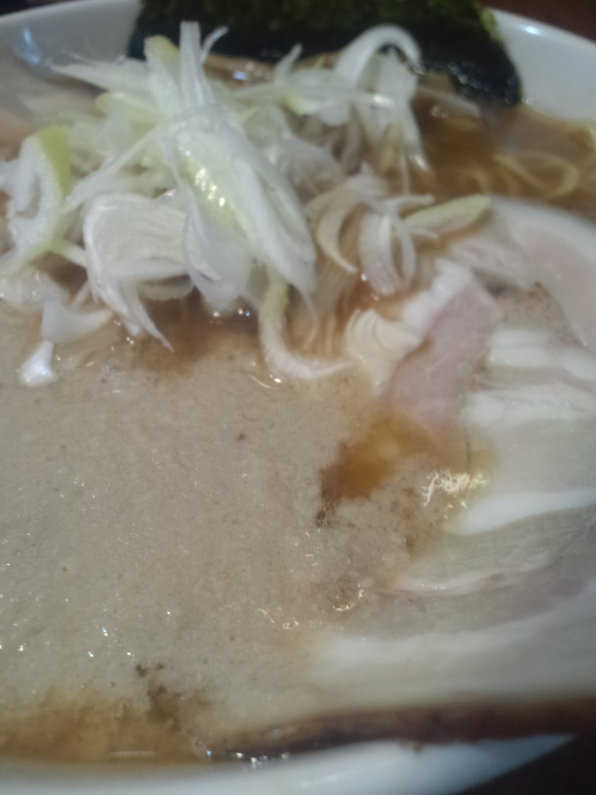 まず写真の器内手前側、見た目がトロロにも見えるエスプレッソと呼ばれている、後のせトッピングの部分を避けて、レンゲでスープをすくって口へ。すると、悪魔的にカエシがガツン!とまでではないですが、「カツン」な感じでショッパー。