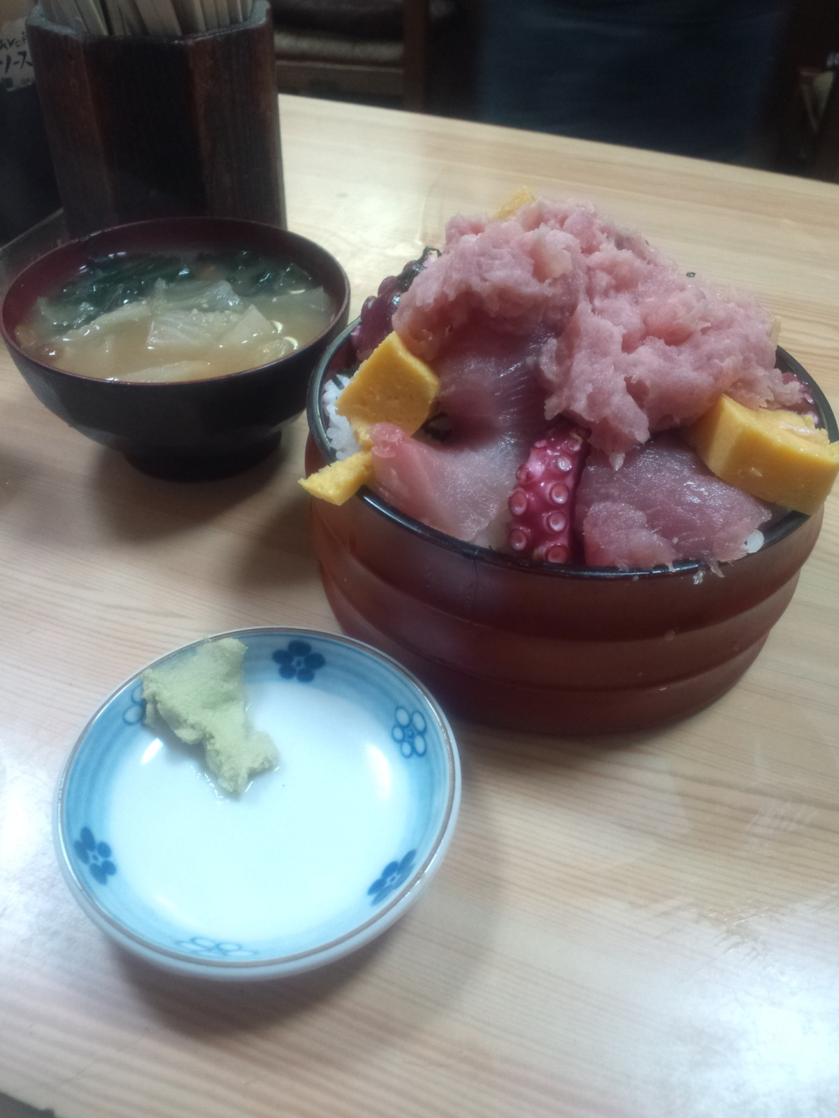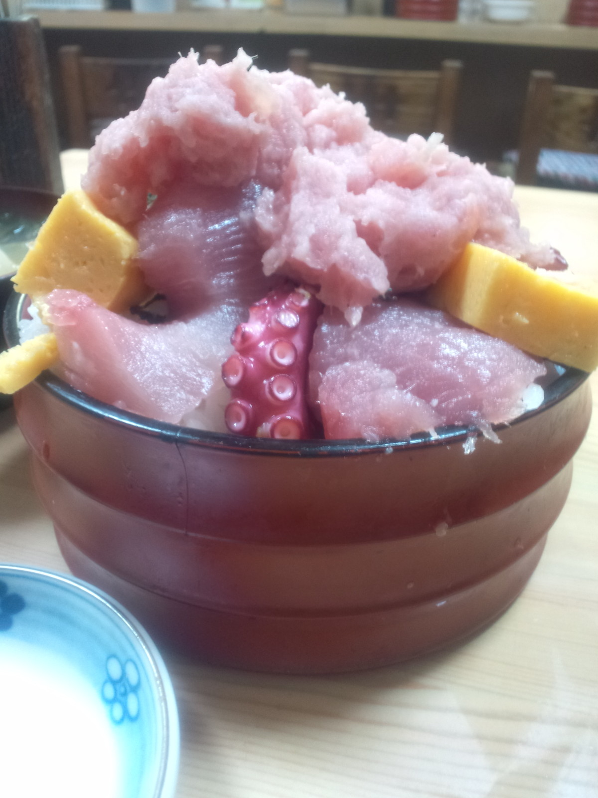 桶にしっかりと盛られたご飯とネギトロ。ご飯は1.5合くらいですかね。2合くらいにすれば良かったかなぁ。ネギトロ、タコ足、メジマグロ?刺身と玉子な感じ。