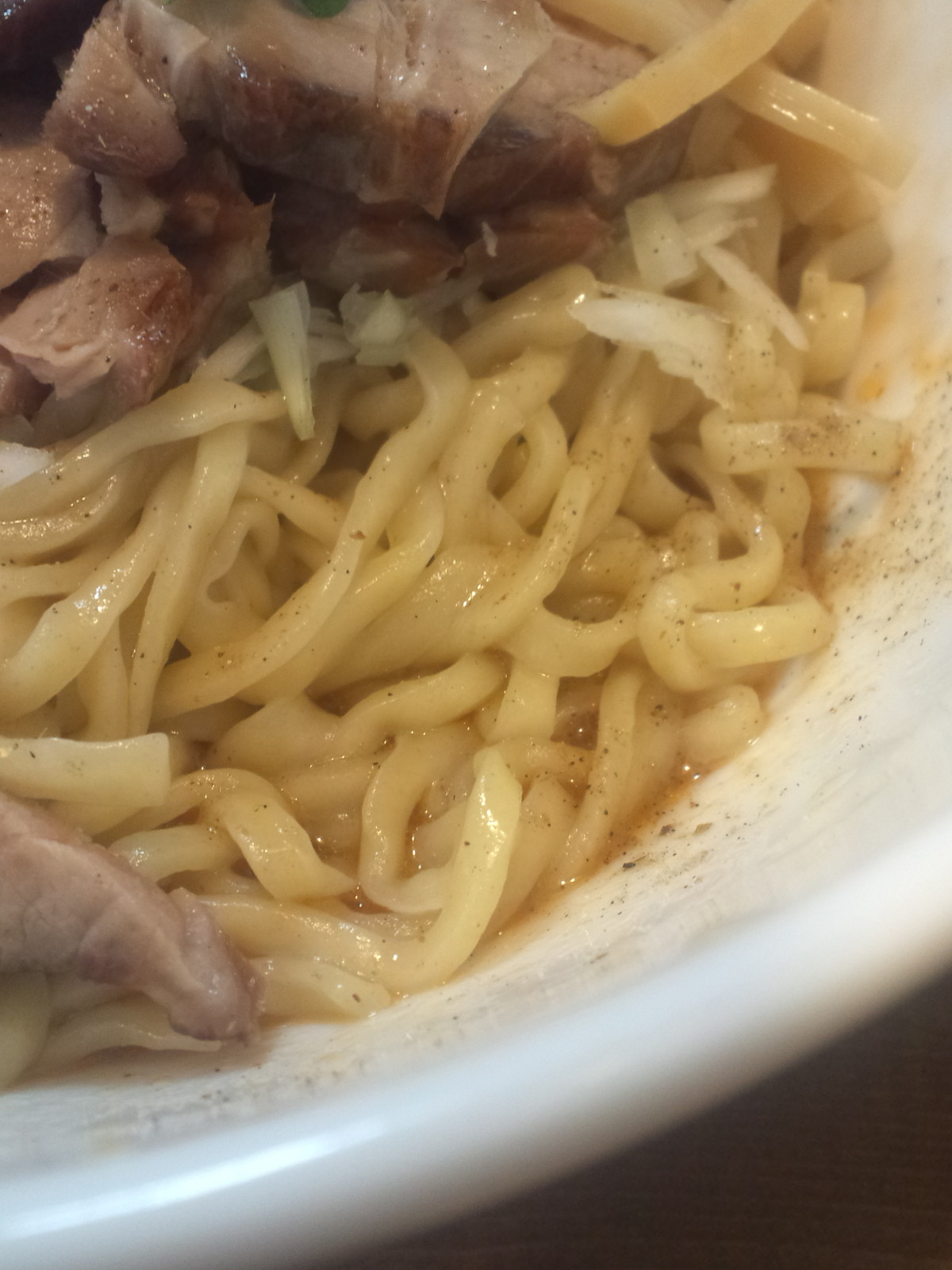 スペースを使って麺を混ぜ混ぜ。テカりがあまりないので、油がそんなに多くないのが分かります。麺は平打ちな中太なほぼストレート。浅草開花楼製なんですね。