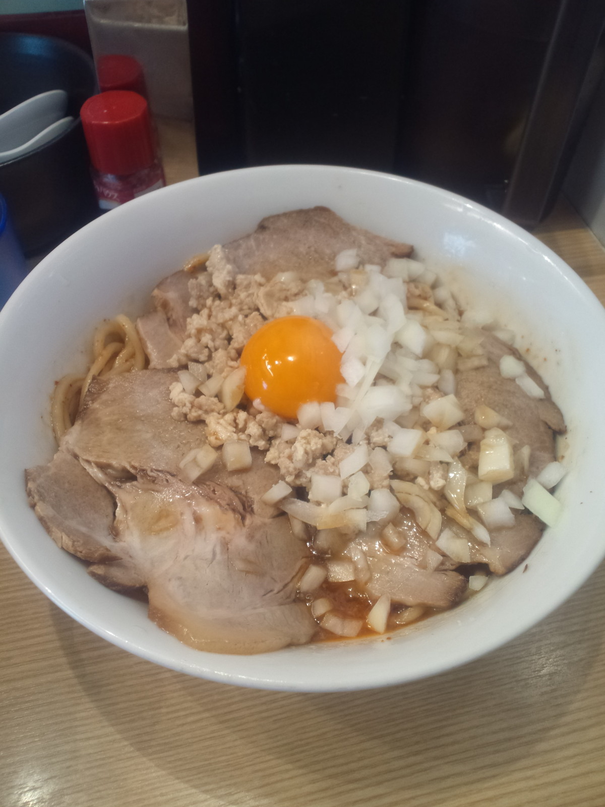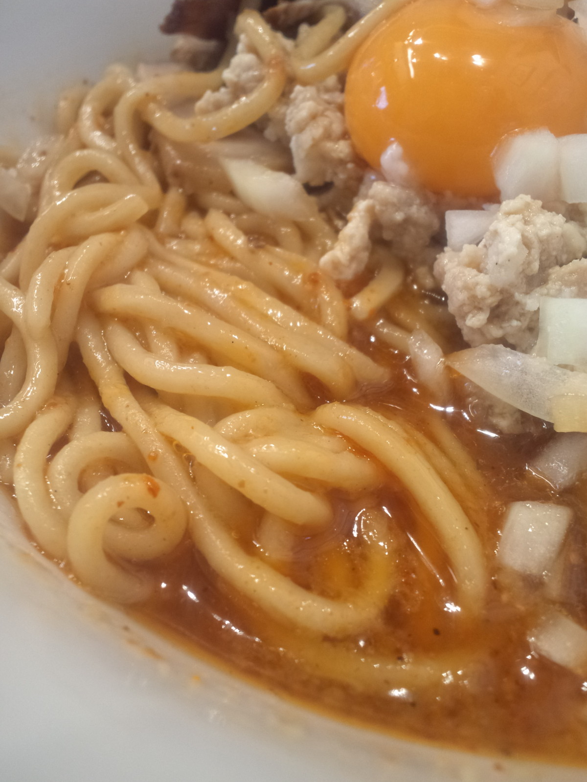かき混ぜようとしてみると、あ、麺がデフォと違います?新橋でのデフォはこれなのかな?