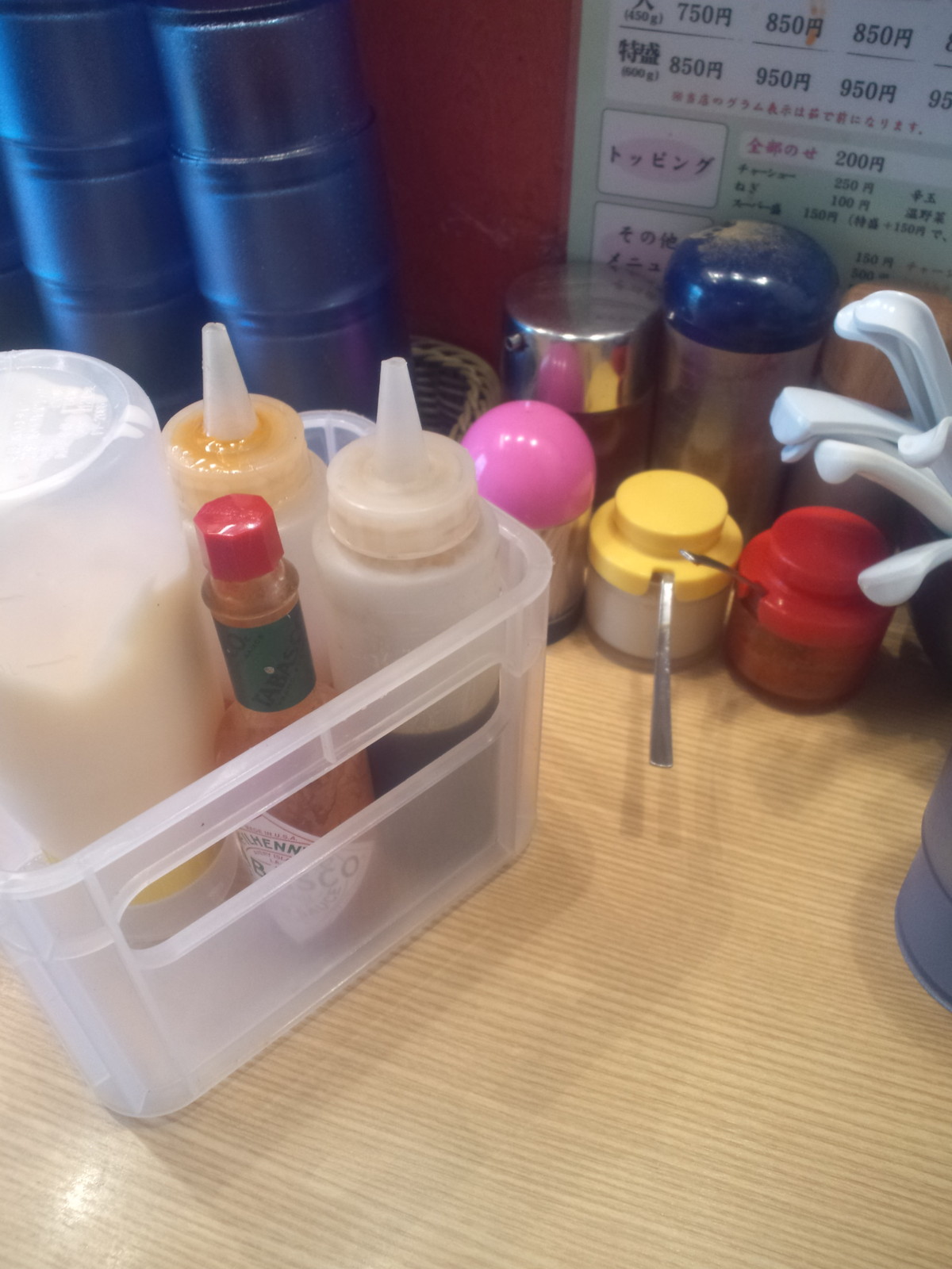 かごの中は卓上には魚粉、こしょう、一味、おろしニンニク、豆板醤、酢。配膳時にマヨネーズ、辣油、タバスコ、醤油ダレな感じ。