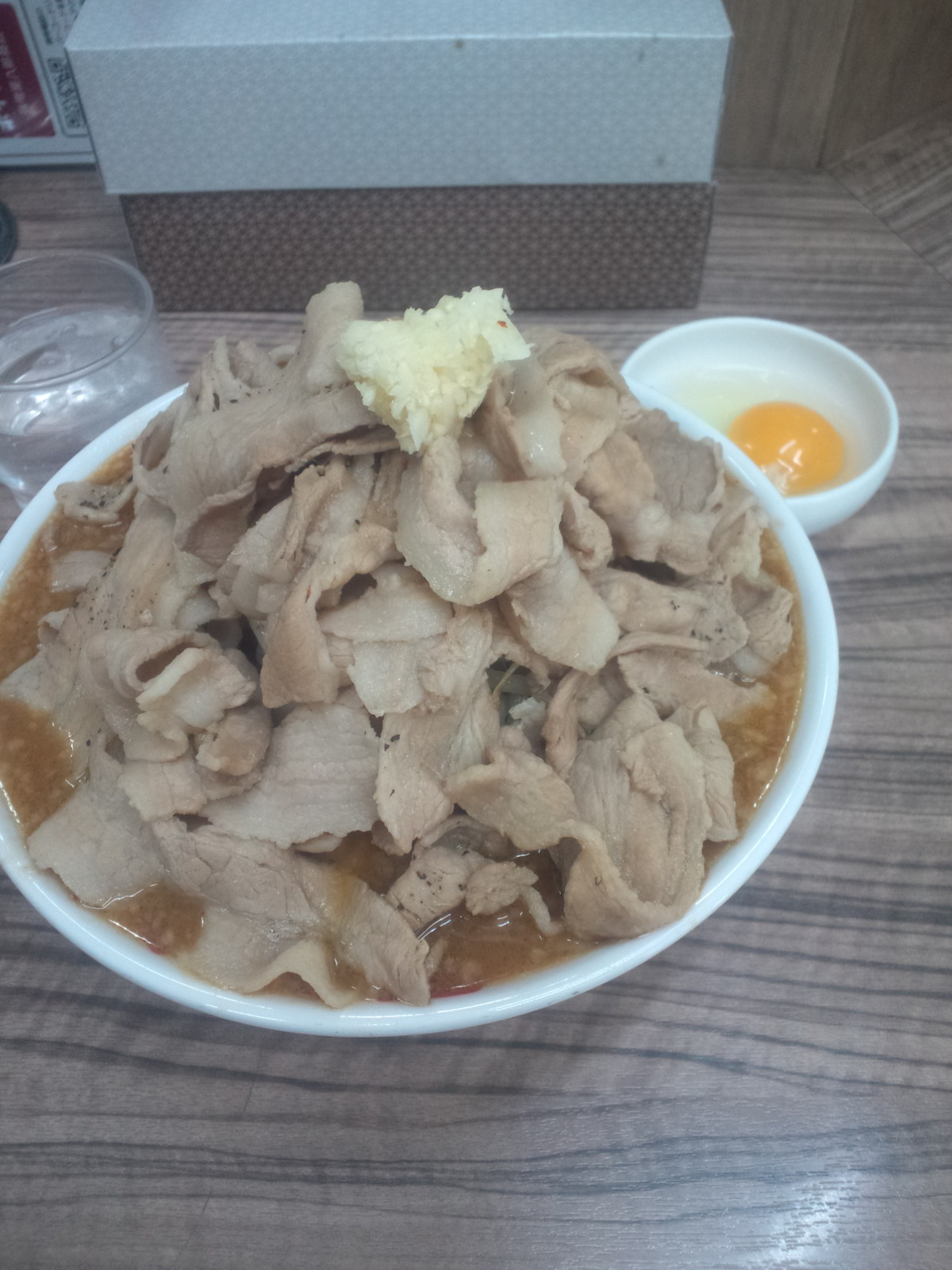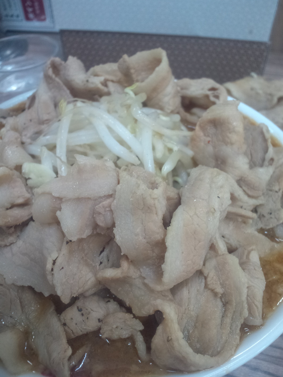 豚切り落とし的なものがたっぷり乗っています。本当にたっぷりですねぇ、とスペースを作るために肉を避けてみると、もやしがたっぷり。