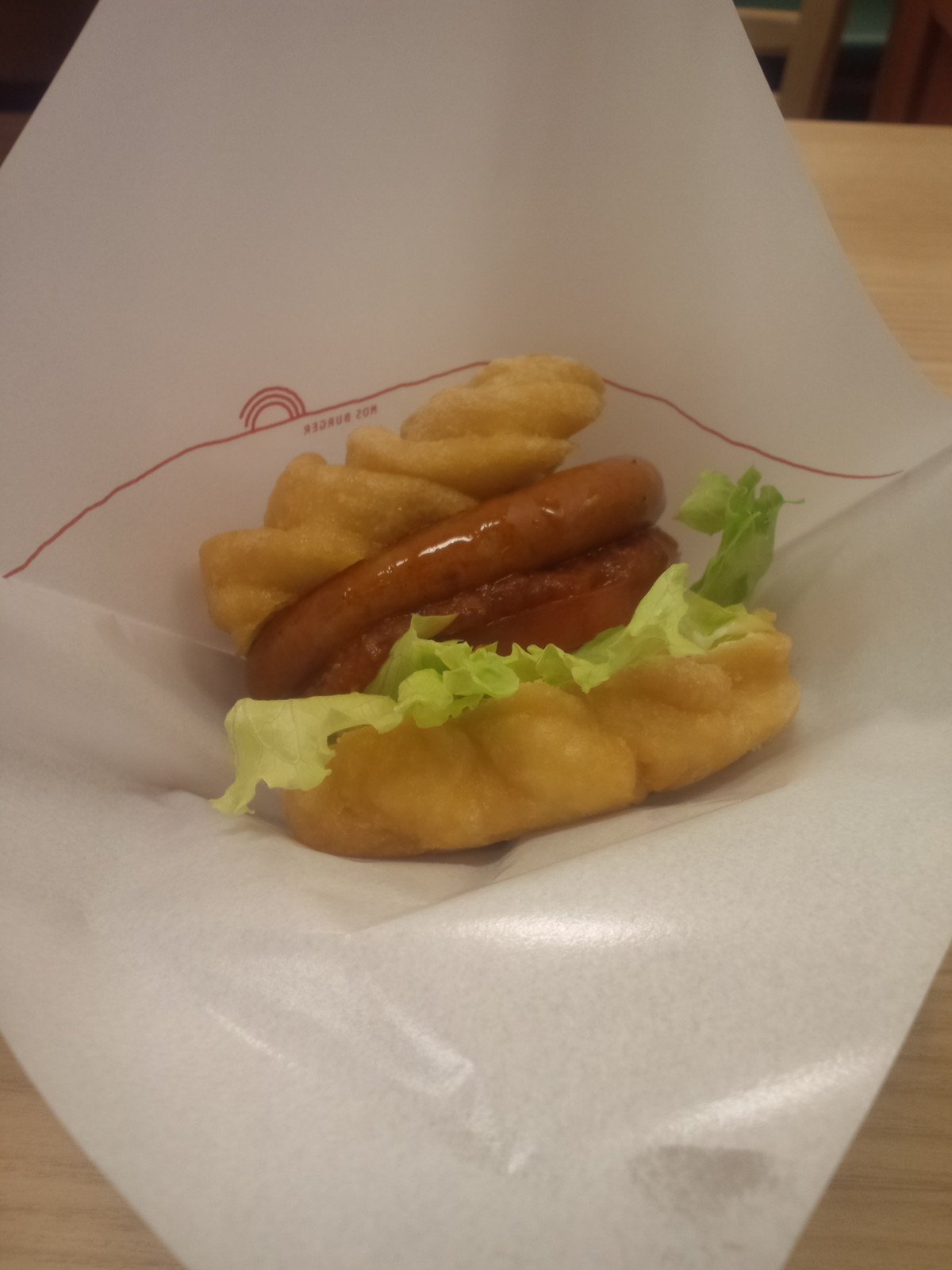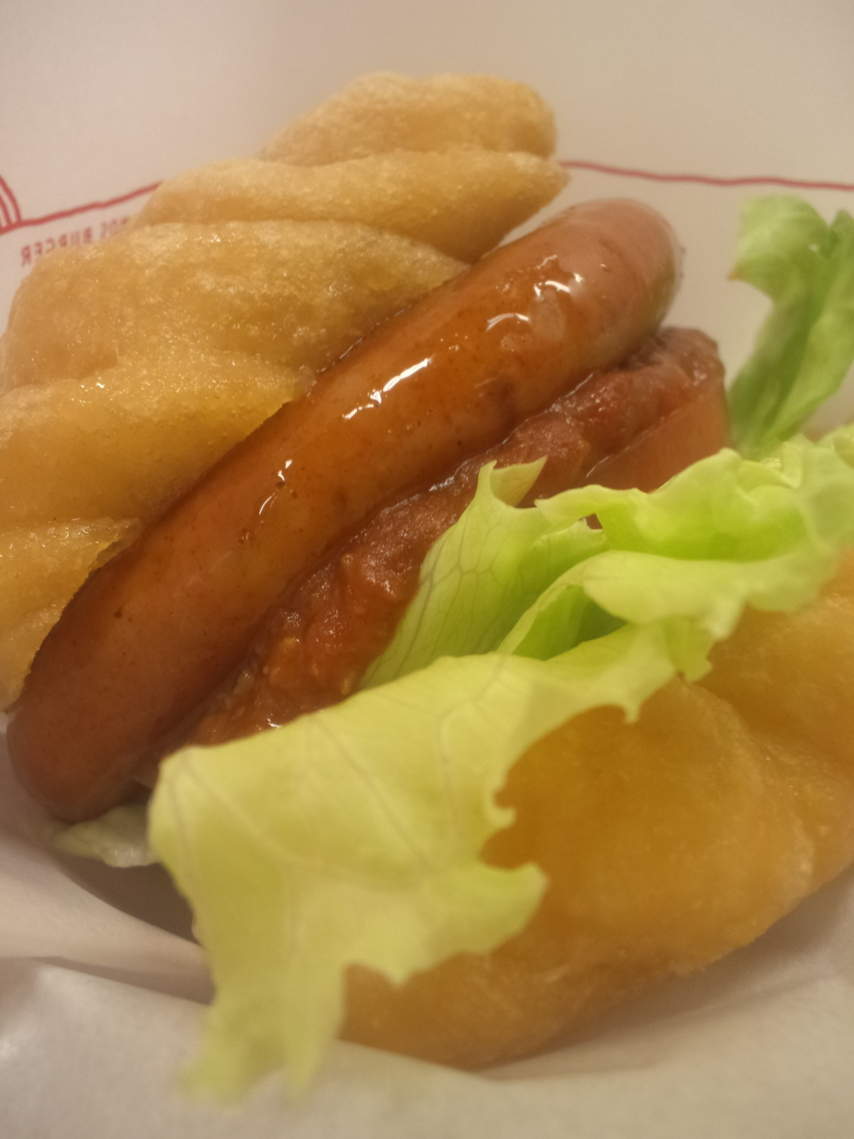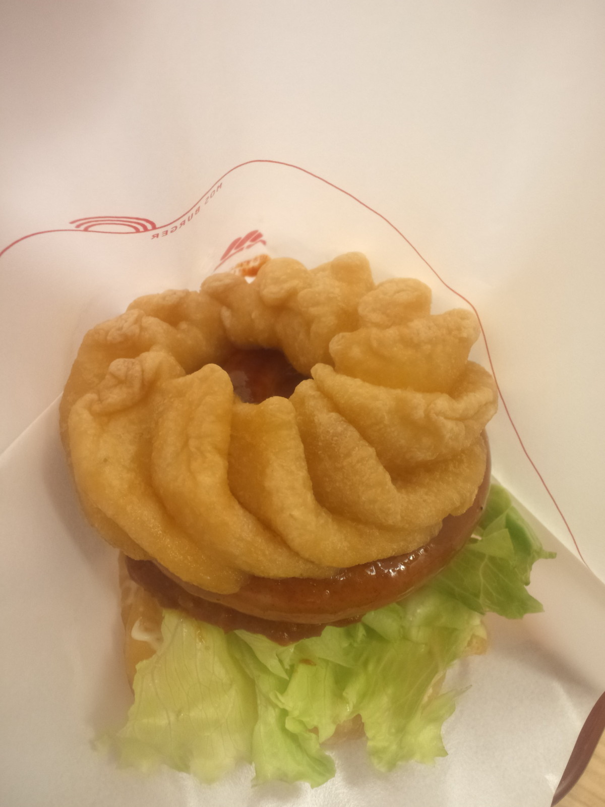 一番の目玉?バンズ的存在のフレンチくルーラーはやわやわで、個人的には好みではなくて残念過ぎ。ミスドで売っている時のような、しっかりした食感まではいかないにしろ、もちっと何とかならなかったのかな。