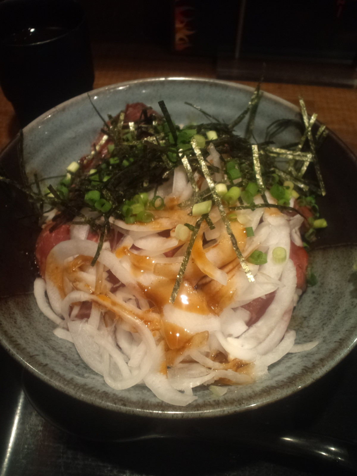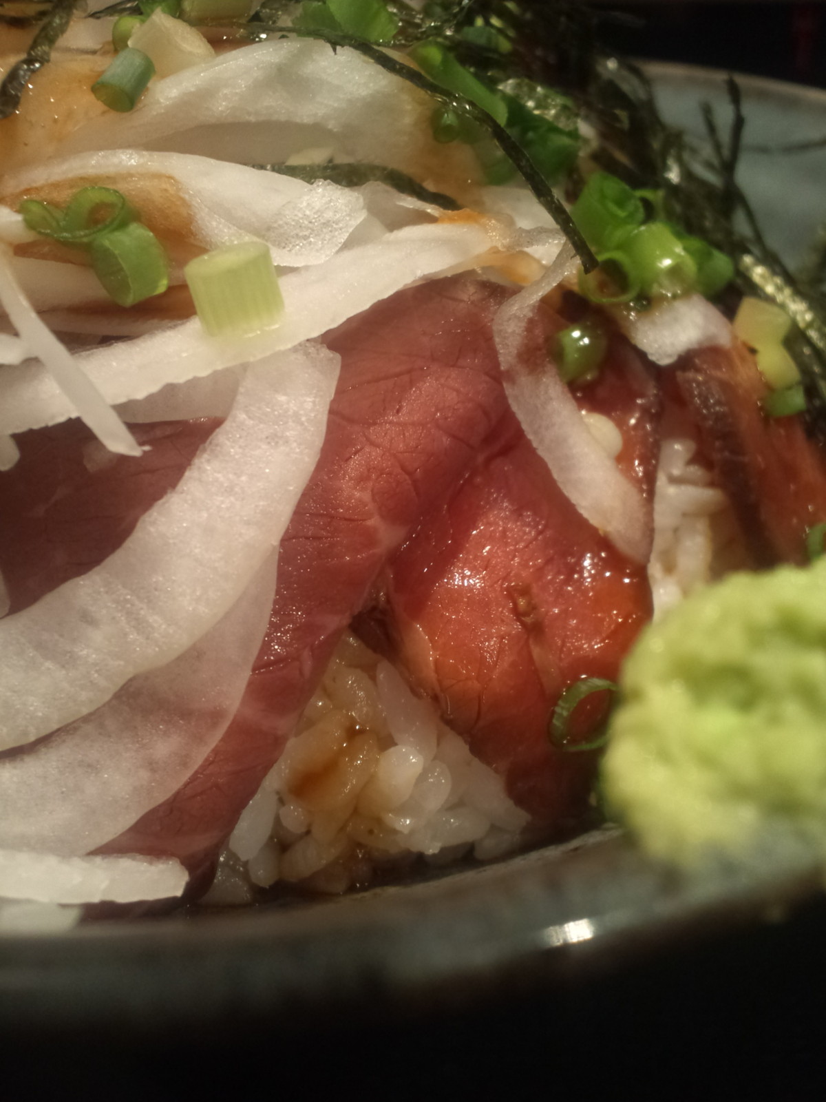 たっぷりのスライス玉ねぎが盛られて、今ひとつ見栄えが・・・が第一印象。既に醤油系の?たれがかけられていて、丼の端におろしわさび。しかし、このローストビーフ丼をレンゲではちと食べにくいかな、と卓上から箸を取ります。