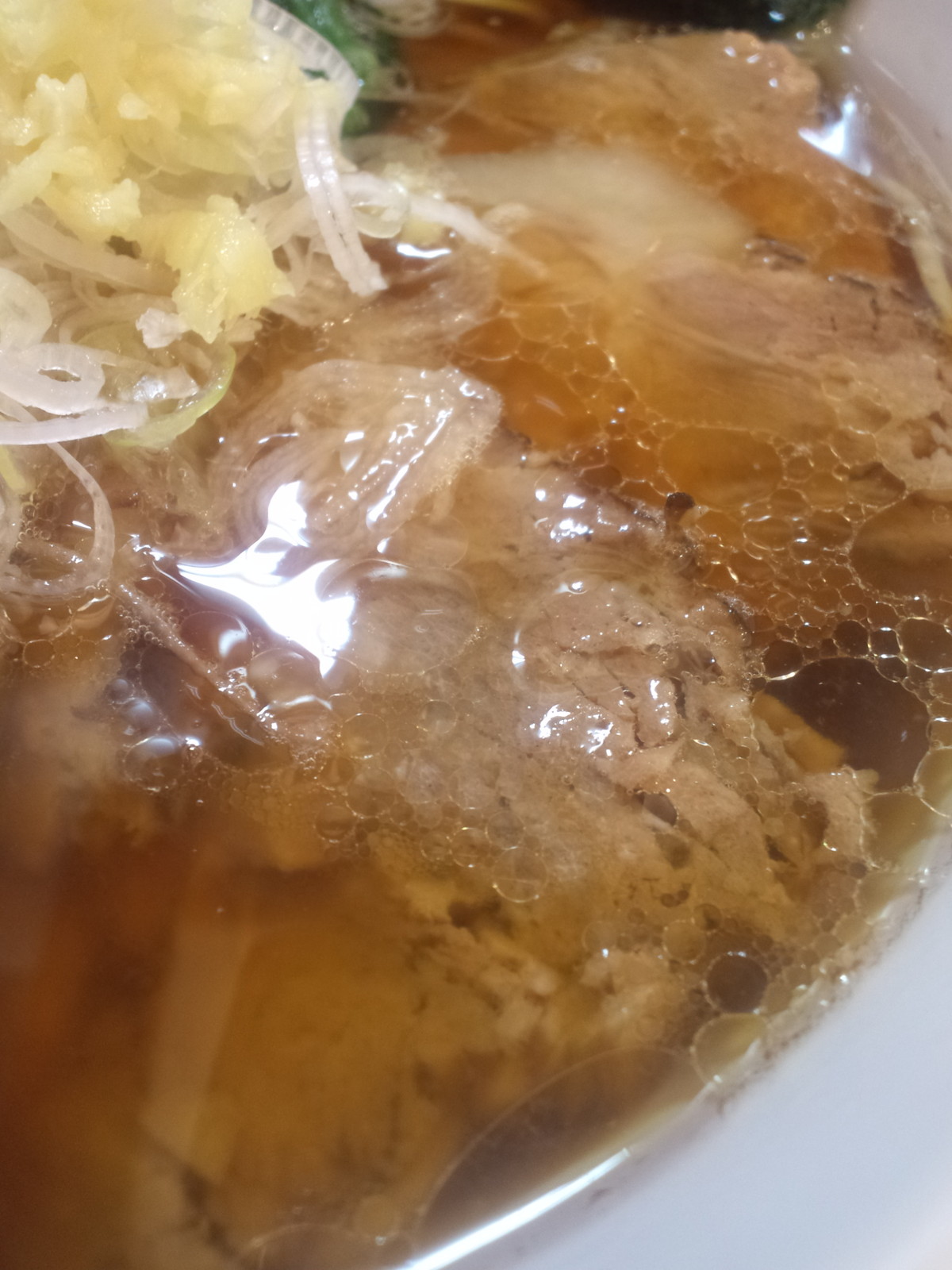 まずは生姜を避けて、と、厚めな油膜の下には茶色いスープ。透明感ありげ。