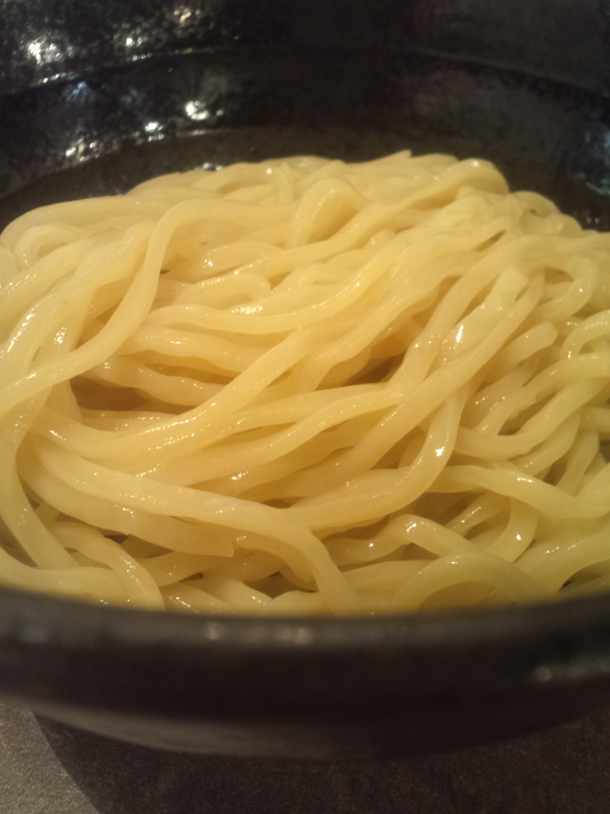 麺は気持ち透明感のあるものでほぼストレート、表面はザラった感じで麺の持ち上げはかなり良さそうに見えます。水道水で締められた感じの冷たさながら、芯がしっかり残ったような、しっかり固め食感ですね。