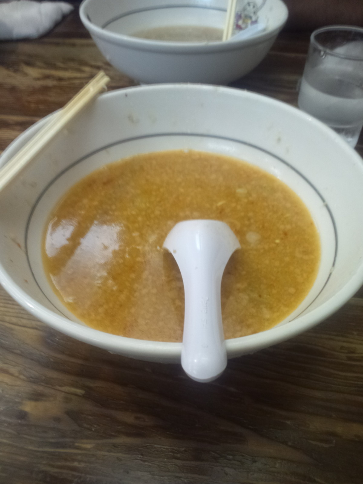 かと思いきや、臭みもなくしっかり重みを感じながらも体調が良かったからか、豆板醤の味変のおかげか、1次会は魚中心の和食だったからか、程なく完食。唇のペタペタは仕方ないから置いておいて、口周りの脂はハンカチで拭き取りつつ、後ろ髪引かれる思いで、スープをレンゲで口へ一度運んで、本当に完食です。
