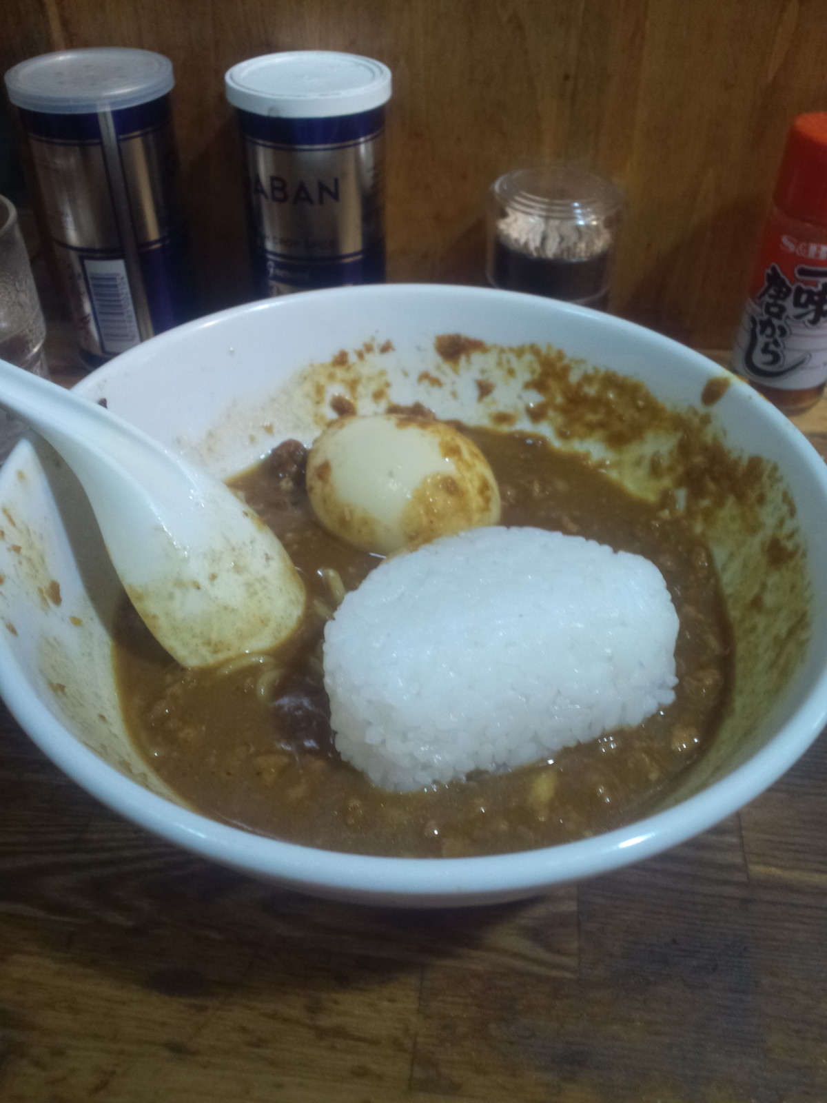 大判のチャーシュー1枚と大きい卵と具材はシンプル。・・・ちと寂しいかも。って、肩ロースが多々入ったらしいカレールーも、ある意味具材ではあるんですが。まずはカレーを混ぜずにスープだけレンゲで頂いてみると、濃厚鶏的なスープでうま。カレーと混ぜていないからか、塩気は足りずのモノ足りない感じですが、濃厚さではモノ足りなさはなし。