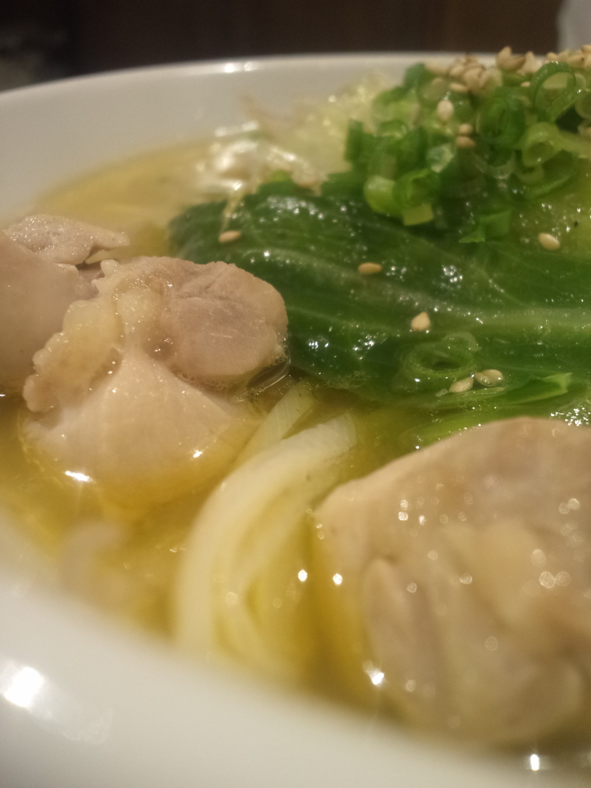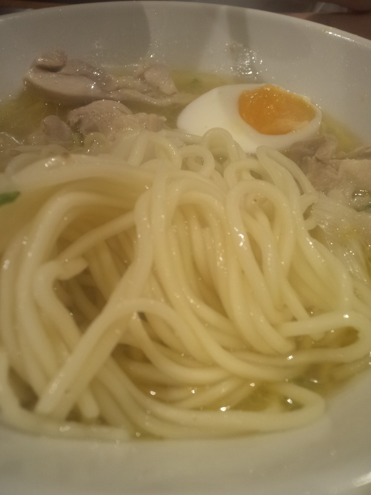 締めでそれなりに満腹なはず、なのにこのビジュアル、この見た目に惹かれるぅ!が第一印象。まずスープから頂いてみると、もっと鶏白湯、鶏濃厚なタイプかと思いきや、名前の通りなのか、そこまでは濃厚でないものの、しっかり鶏〜。